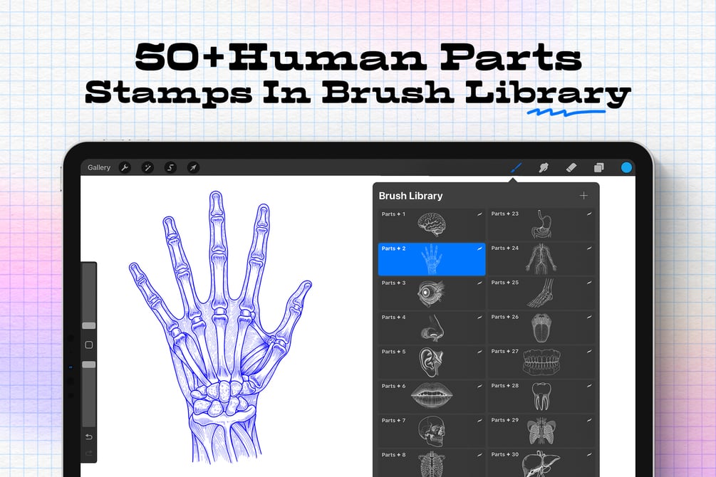Each Stamp Features Carefully Illustrated Body Parts, Including The Heart, Brain, Skull, Bones, Muscles, Organs, And More. Easily Drag-And-Drop Into Your Canvas To Speed Up Your Workflow And Add Precision To Your Sketches Or Concepts.