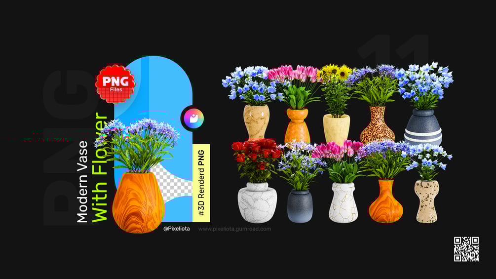 Introducing the captivating Modern Vase With Flower ✦ Pack – A remarkable pack that will elevate your creative design projects to new heights. This extraordinary offering features a stunning collection of meticulously crafted 3D rendered PNG images, showcasing modern vases adorned with exquisite flowers.