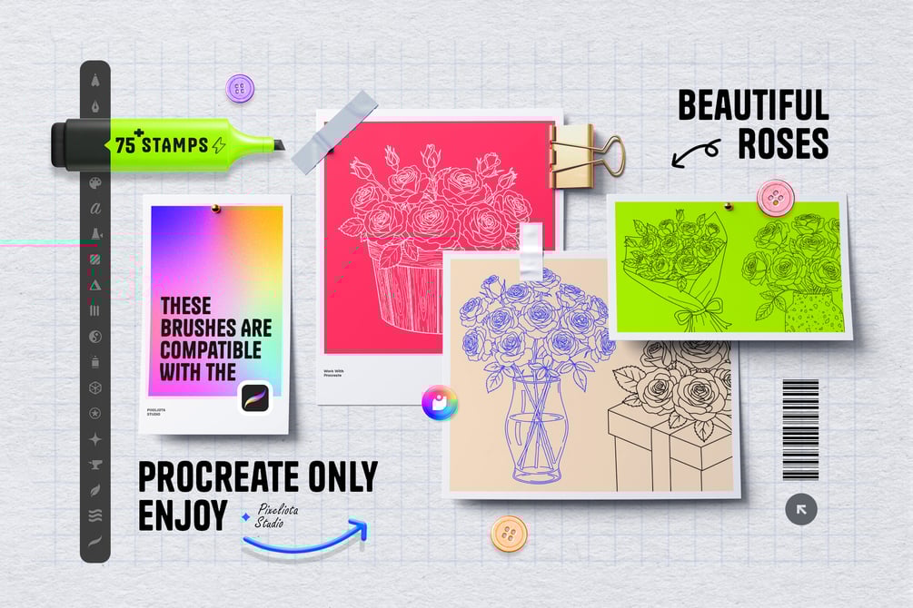 This Elegant Pack Includes 75+ Rose Stamp Brushes, Carefully Designed To Help Artists And Creatives Add Beautiful Floral Elements To Their Work Instantly.